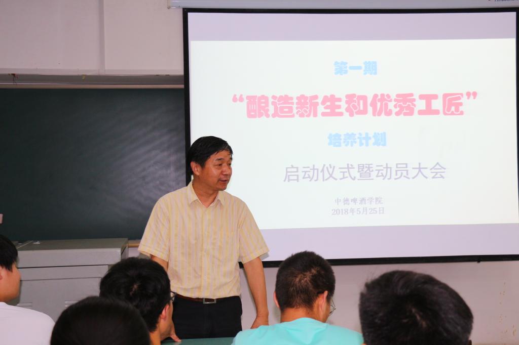 (学生胡逸帆讯)5月25日下午,“酿造新生和优秀工匠”培养计划启动仪式暨动员大会在我校B704教室成功召开,中德啤酒学院党总支书记、院长程汉生老师、副院长杜波涛老师、刘光成老师出席大会。会议由酿造教研室主任崔汉斌老师主持。