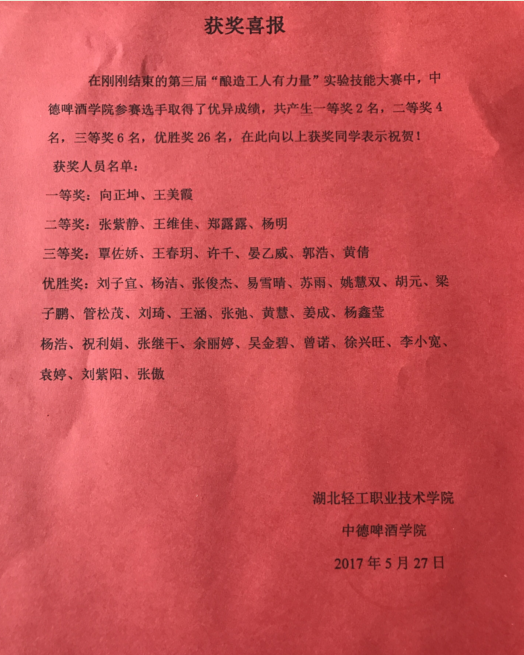 (中德啤酒学院余丽婷讯)为了进一步提升学生专业学习兴趣,增强实践操作能力, 5月25日下午2点30分在湖北轻工职业技术学院实验楼3楼举办了“酿造工人有力量”实验技能竞赛。中德啤酒学院副院长刘光成老师出席了本次活动,吴长春老师任竞赛总裁判长。