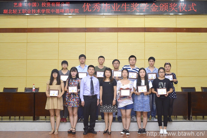 (中德啤酒学院 陈敬春讯)2015年6月16日上午10点,2015年艺康优秀毕业生奖学金颁奖仪式在湖北轻工职业技术学院学术报告厅隆重举行。出席颁奖仪式的嘉宾有艺康(中国)投资有限公司食品饮料市场部总监高德珩女士、艺康大中华区第五大区副大区经理王建军先生、中德啤酒学院院长刘少清先生、中德啤酒学院党总支书记程汉生先生,中德啤酒学院实训部陈敬春主任主持了颁奖仪式。