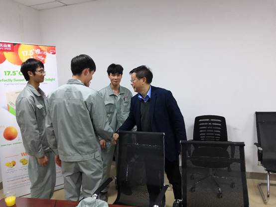 参观结束,方书记一行与正在工厂实习的17级农夫山泉班的同学们进行了座谈,了解他们在校企衔接中是否能顺利过渡,在企业适应如何,十分关心校企合作过程中现代学徒制是否落到实处,学校目前的专业理论基础是否能培养出符合企业要求的员工,再次强调食品加工技术专业,机电一体化技术专业的人才培养方案,仍要继续与企业深入沟通,不断优化,要充分体现出学生学徒双身份。最后,方书记与同学们一一握手并嘱咐他们,要珍惜自己的农夫学子的身份,在工厂要好好学习专业技能,多看多钻研,把知识吸收,把机器摸透,在工厂好好工作。中德啤酒学院程院长提醒学生“在实习中要沉下去,才能浮的起来”,机电工程学院张院长也赠予同学们四字箴言“珍惜;争气”。