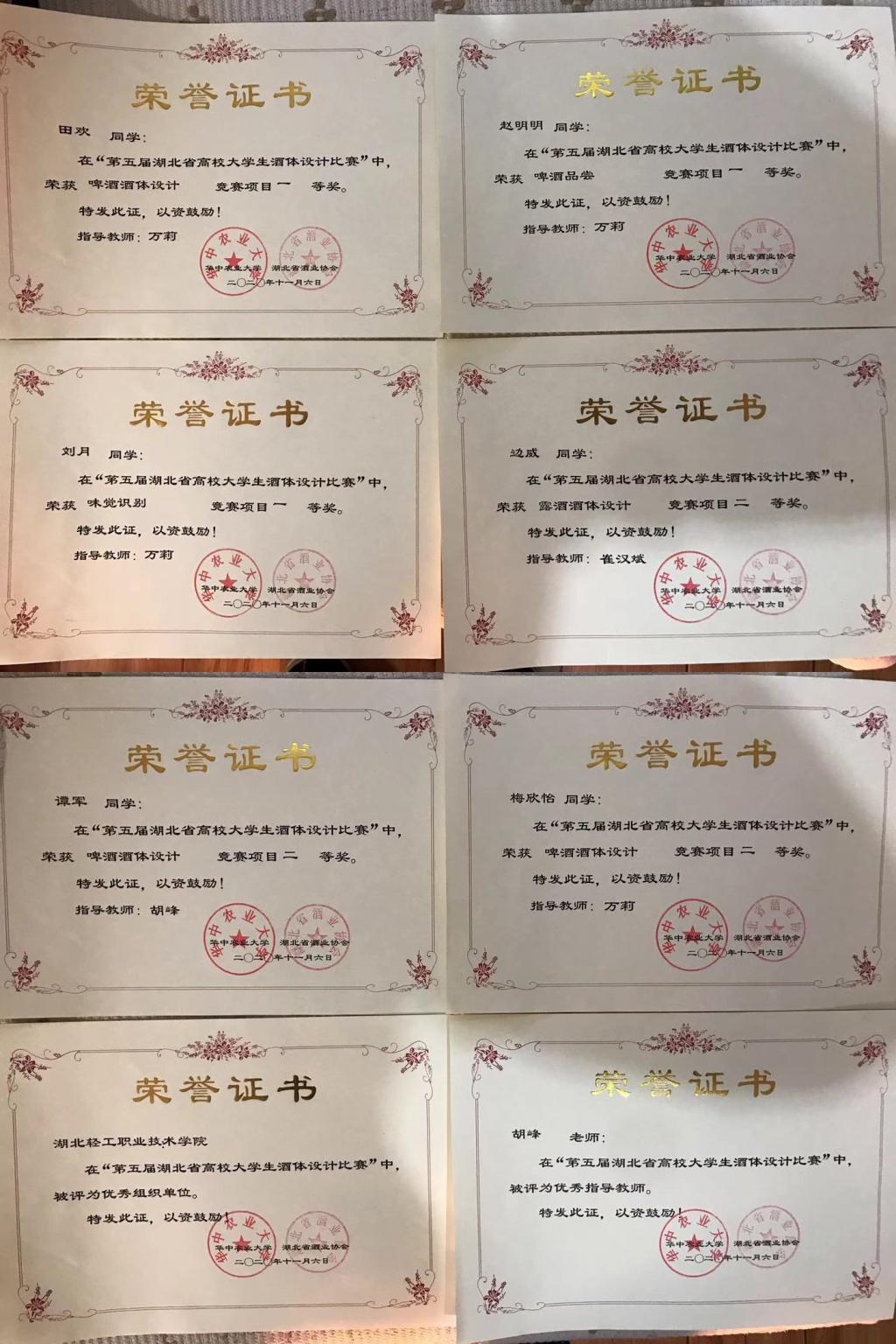 本次大赛由湖北省酒业协会、华中农业大学和中德啤酒学院联合举办,来自华中农业大学、湖北工业大学、武汉职业技术学院和武汉软件工程职业学院等全省17所本专科院校的157名选手同场竞技。赛前,我院师生精心准备,刻苦备赛。崔汉斌院长广泛动员,精心组织,抽出宝贵时间指导学生修改酒体设计论文。胡峰、万莉和郭卢云老师不辞辛苦,利用每天下午两个多小时的时间,连续一个多月指导学生在夯实理论基础的同时,进行大量的品评训练,临近比赛的两个周末加班加点的指导学生。从自愿报名到层层选拔,2018级酿造技术专业田欢、刘月、梅欣怡、边威、赵明明和谭军6名选手脱颖而出,代表学校参赛。最终,田欢同学获啤酒酒体设计项目一等奖,刘月和赵明明同学分获品评项目一等奖。这次比赛成绩的取得,离不开学院领导的大力支持和师生们的共同努力。
