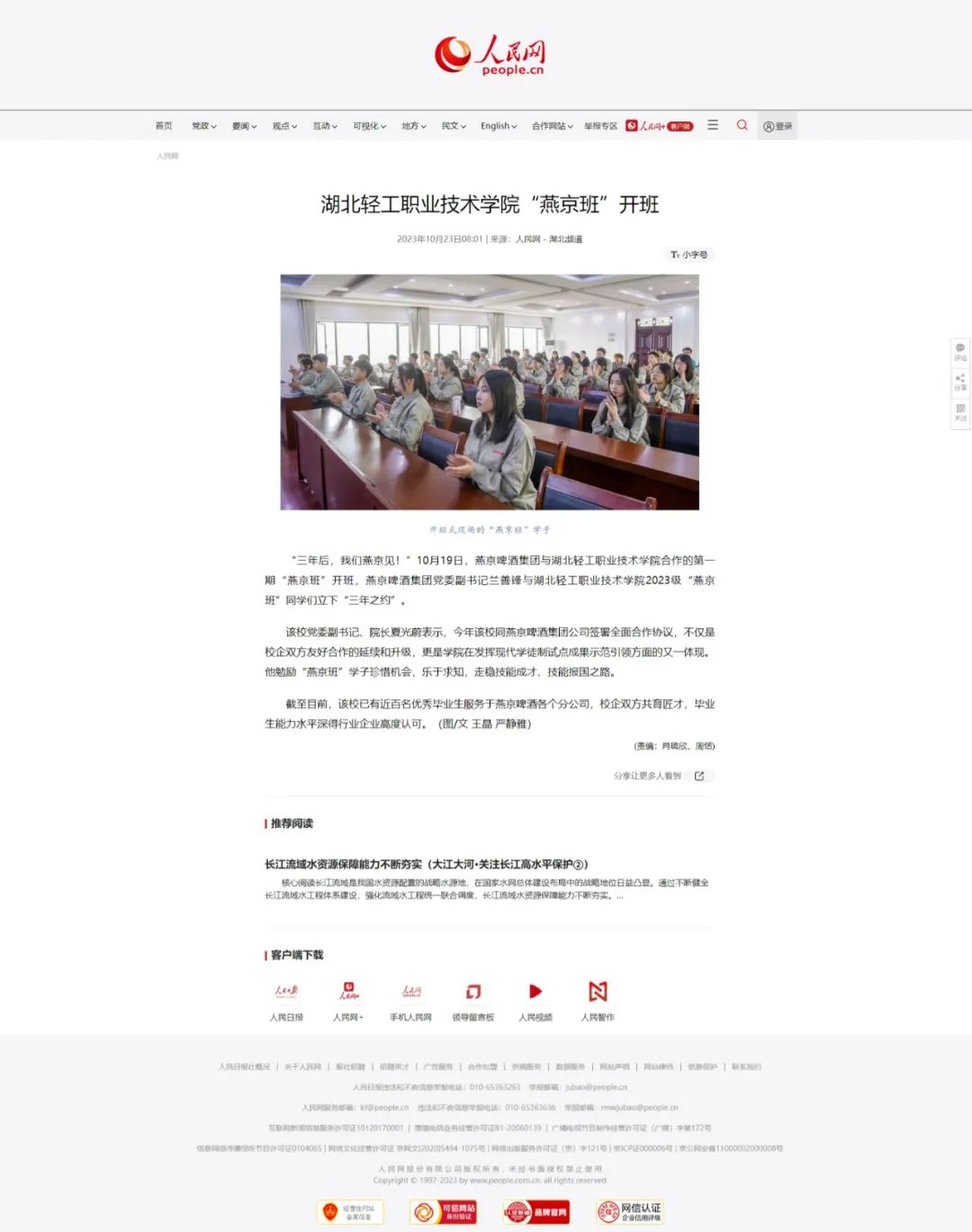 10月19日,燕京啤酒集团与湖北轻工职业技术学院合作的第一期“燕京班”正式开班。该新闻在10月21日由中国教育在线首次发布后,被今日头条、百度全文转载。10月23日,人民网进行了转述报道!