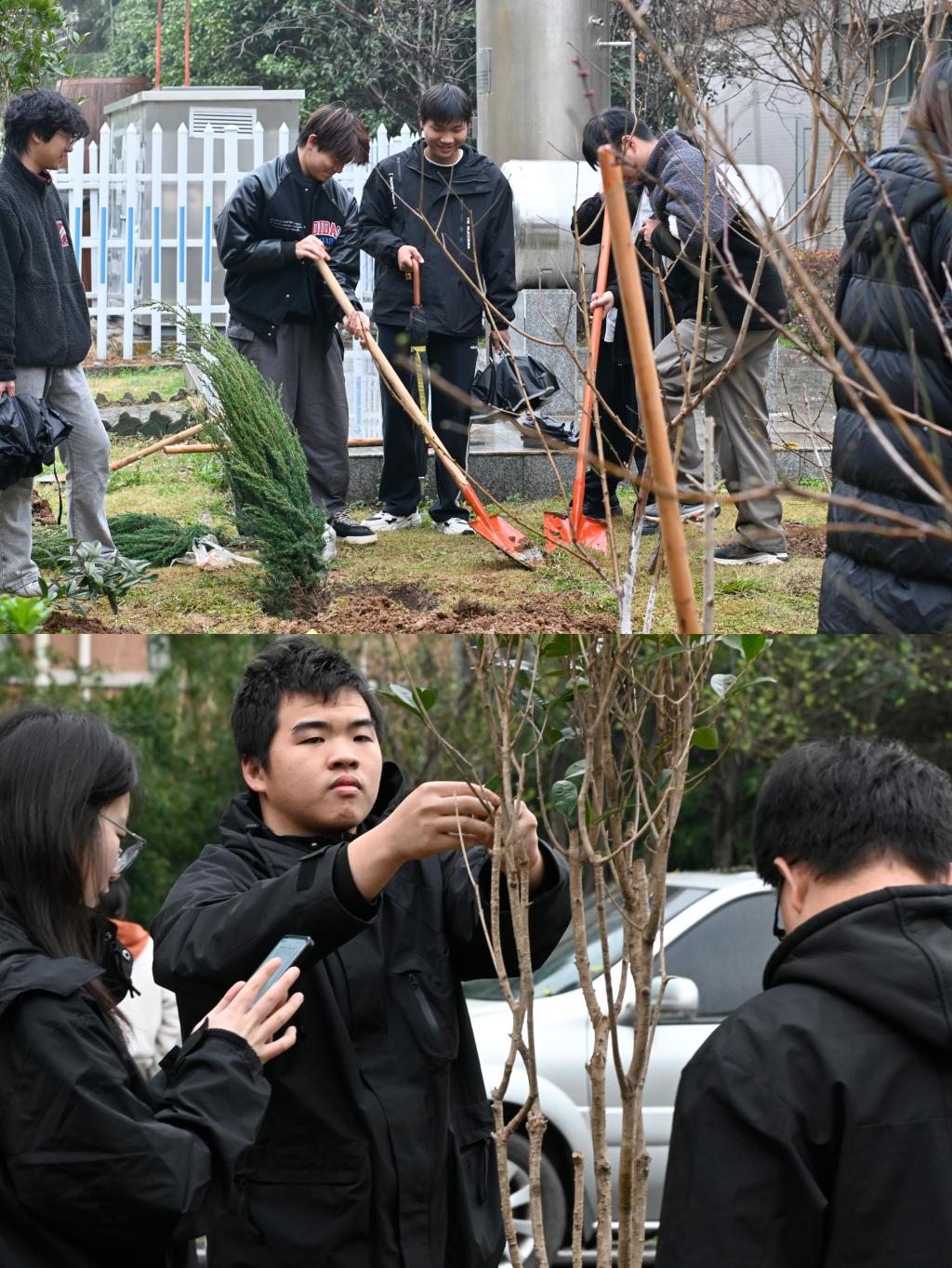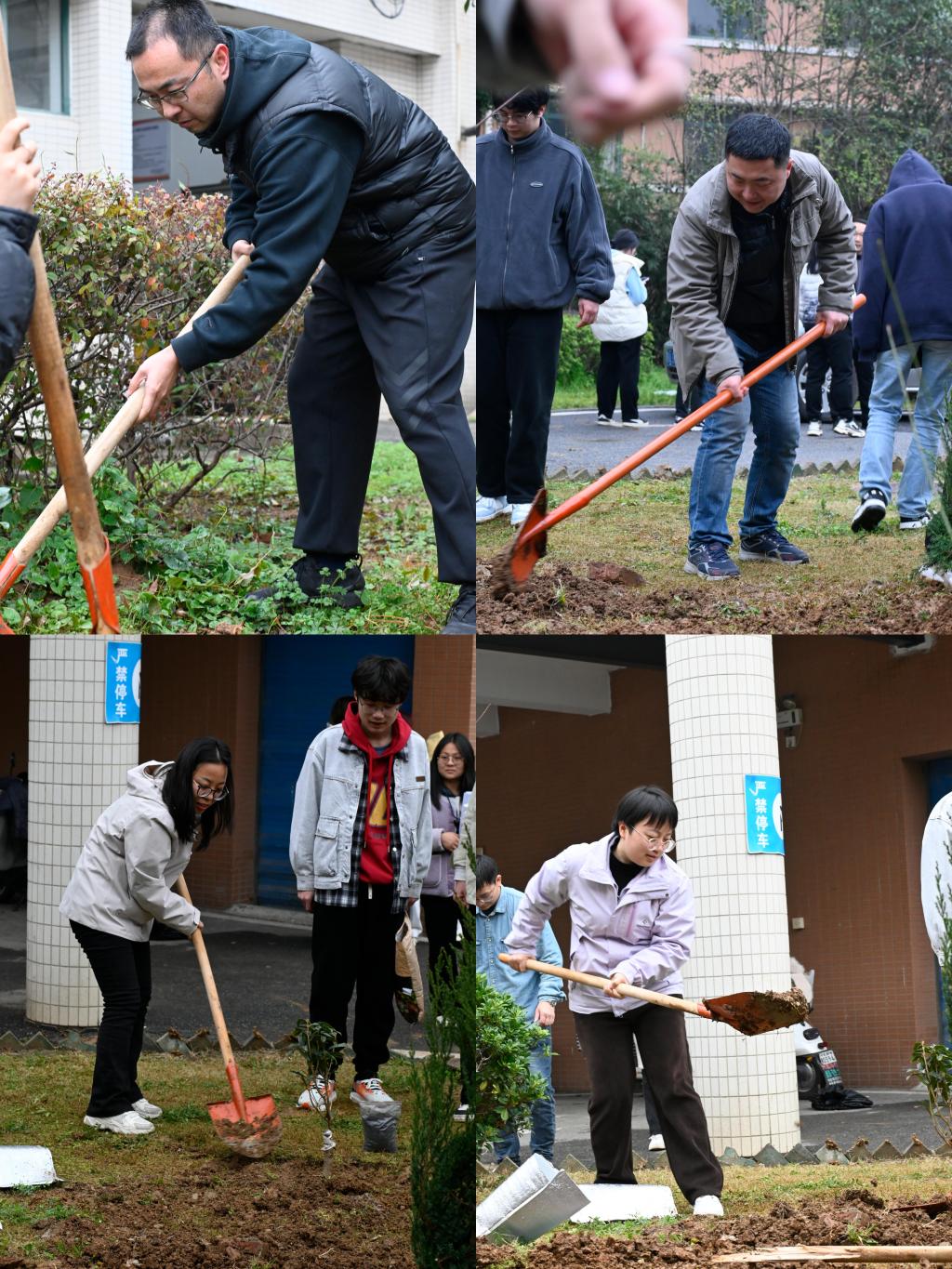 活动现场,大家热情高涨,手持铁锹、水桶等工具,分组合作,挖坑、扶苗、培土、浇水,认真完成每个步骤。经过两个多小时的努力,新栽的树苗在校园里迎风挺立,为校园增添了一抹新绿。学生志愿者代表表示,植树不仅是一次劳动体验,更是一次心灵洗礼,今后会更加关注环保。此外,活动还设置了种树标语和环保小贴士,进一步增强了大家的环保意识。