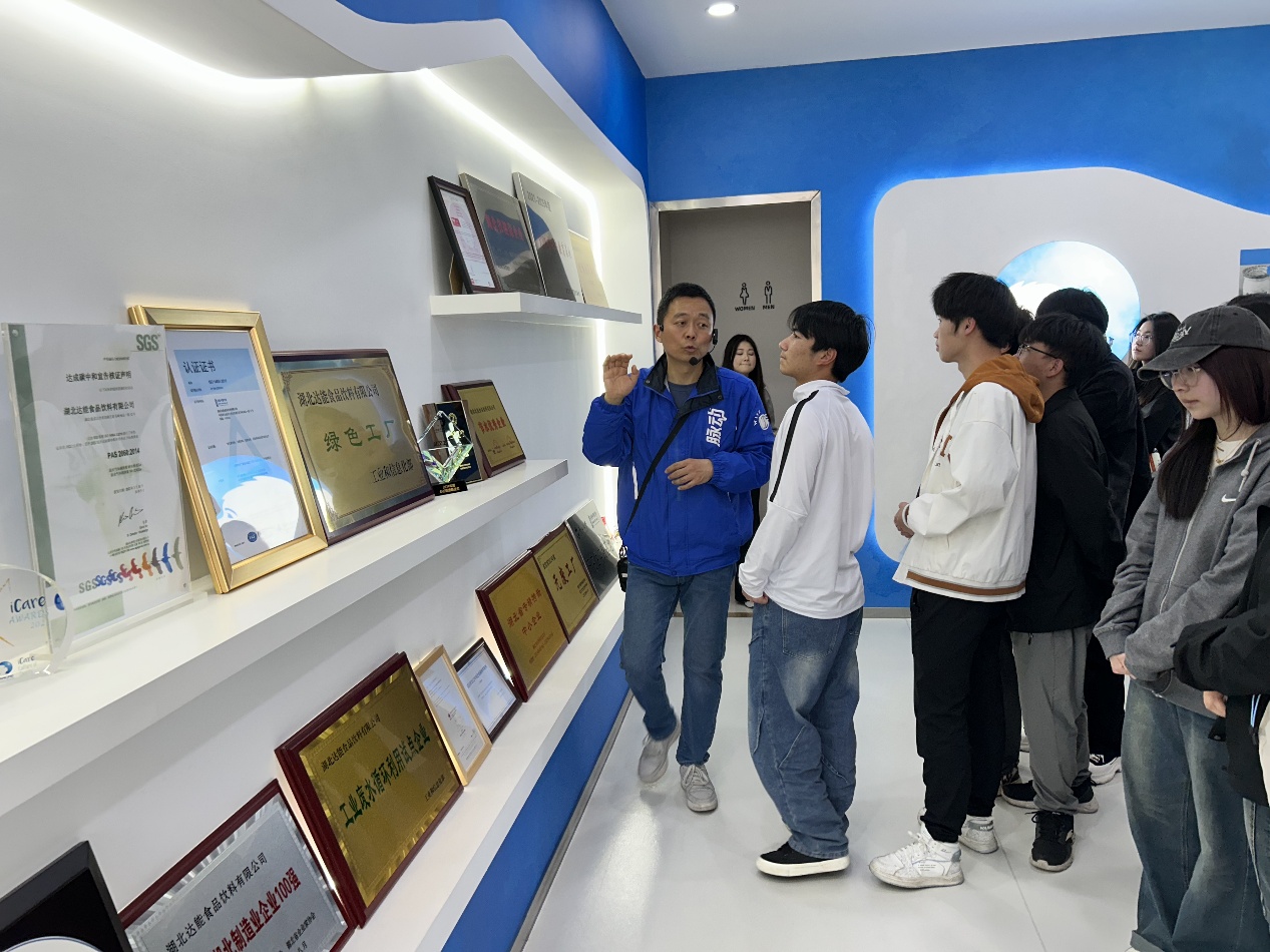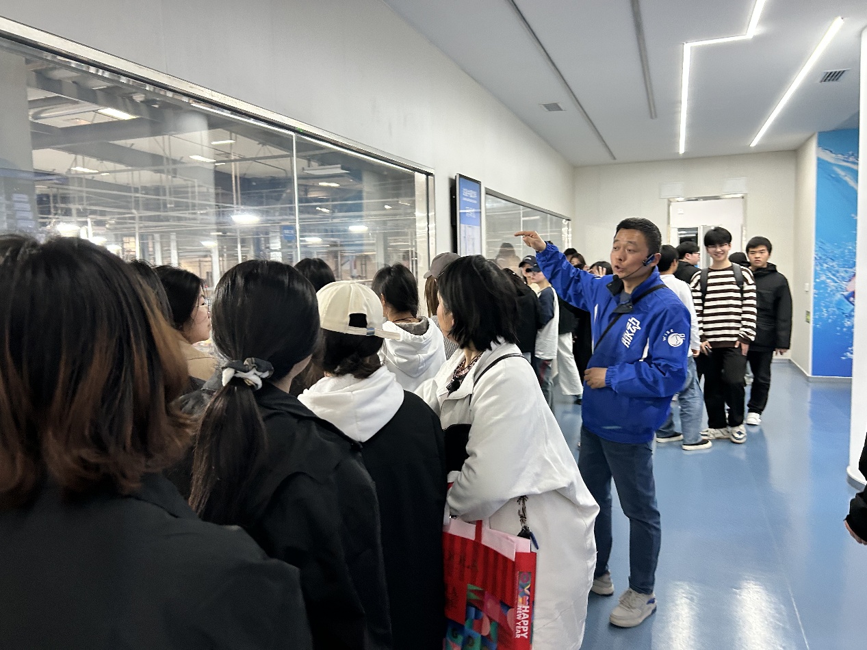 抵达达能工厂后,师生们受到企业宣传部负责人的热情接待,并通过讲解和图文展示,了解到达能集团作为全球食品饮料领域的重要企业,始终秉持高品质、创新和可持续发展的理念,在产品研发和生产工艺上不断追求卓越。随后,同学们参观了工厂展厅,陈列的产品和生产技术介绍宛如一部食品工业发展简史,使大家对食品行业的发展趋势和科技创新的重要性有了更清晰的认识。接着,大家走进脉动饮料生产车间,隔着参观通道玻璃,目睹了一条高度自动化的生产线有序运转,从原材料处理到包装码垛,整个流程精准高效,几乎只需少量工人监控操作。同学们纷纷就设备和检测指标等问题向工作人员提问,得到了耐心细致的解答,对现代化食品生产有了更直观、深入的了解。